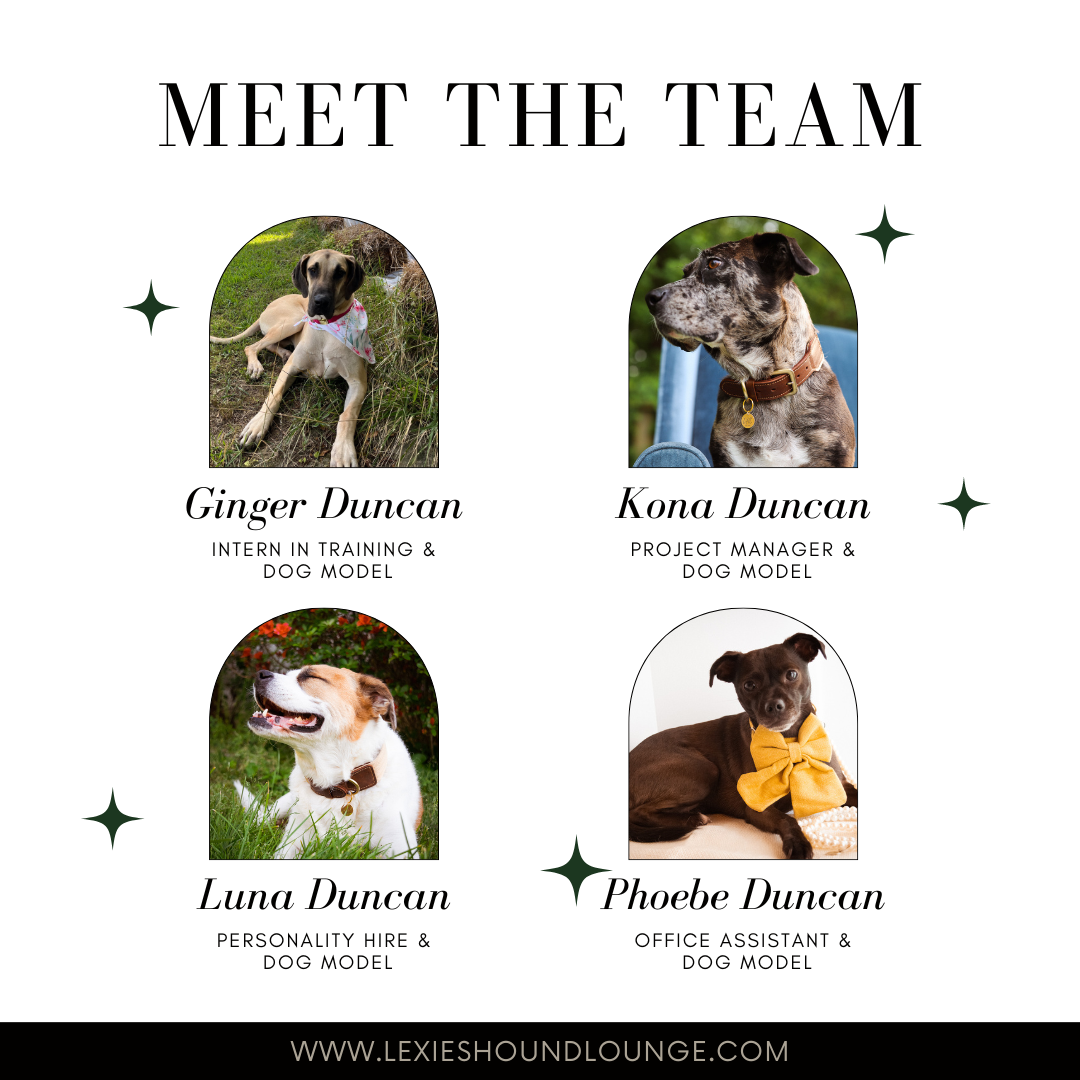Our family is a lively, loving bunch, complete with four amazing rescue dogs – Ginger, Kona, Luna, and Phoebe – who keep life entertaining and full of joy. We also share our home with a spirited cat named Poke and a gentle horse named Coffee. Each of them plays a unique role in inspiring what we do here at Lexie’s Hound Lounge.
