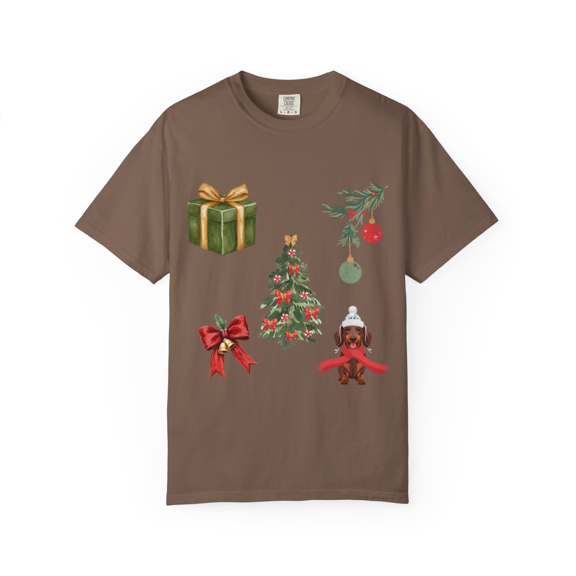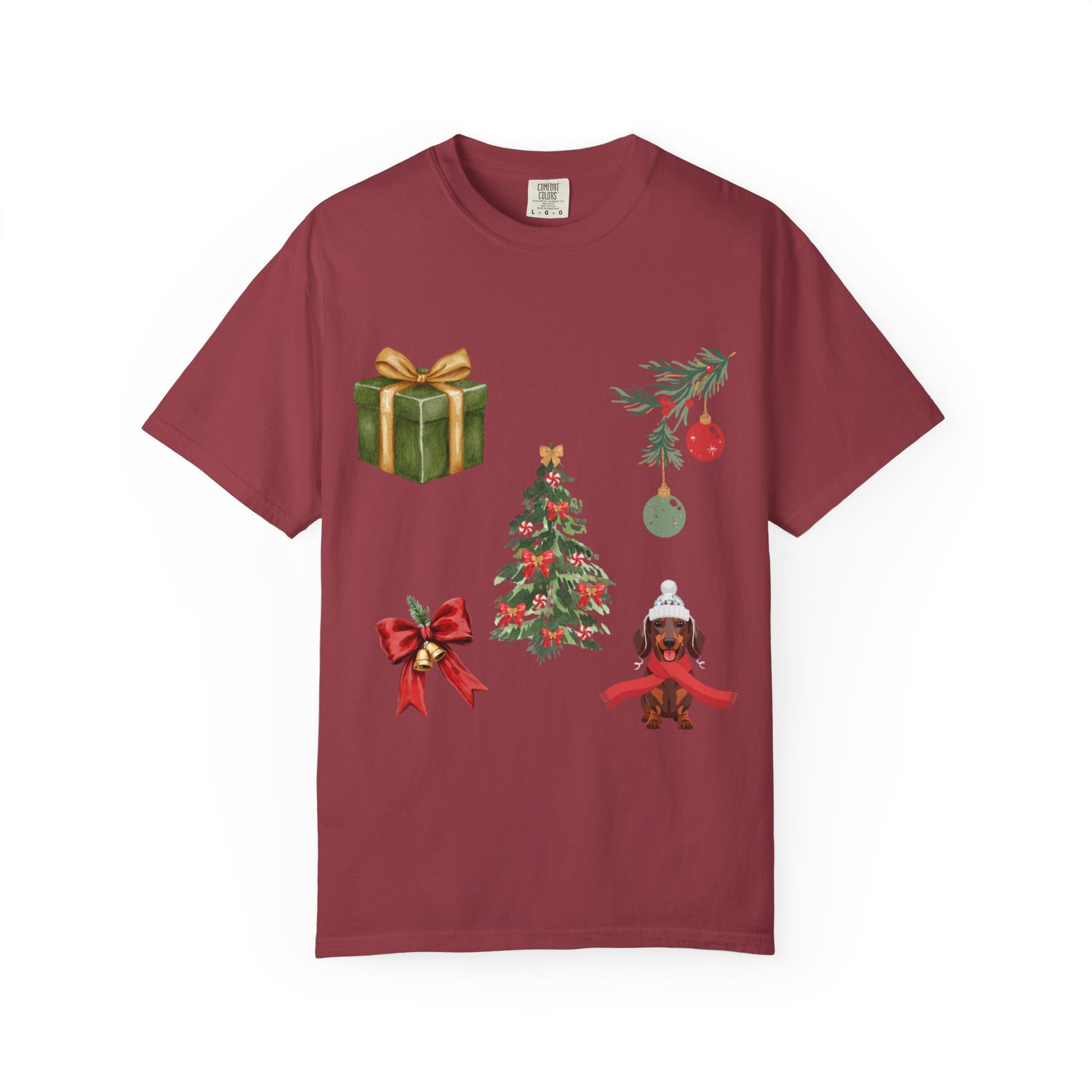 Christmas Icons T-Shirt — Holiday Tree, Gifts & Dachshund Dog Design