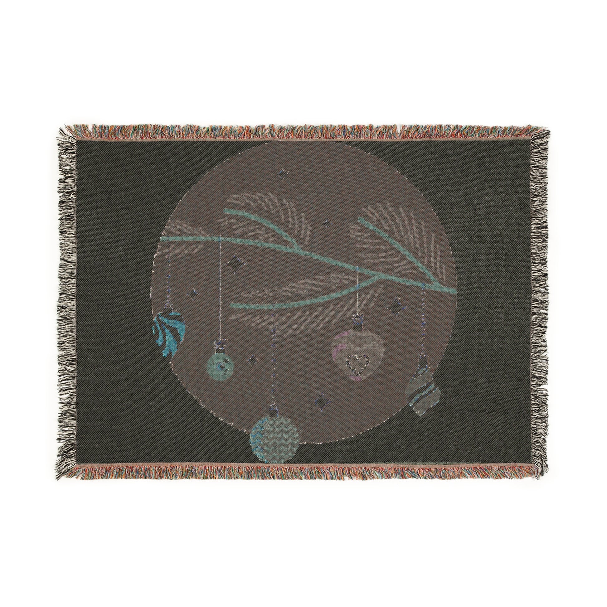 A cozy, hand-tactile woven blanket that channels quiet holiday wonder. Soft 100% cotton threads form a detailed circular scene of evergreen sprigs and dangling ornaments, where tiny stars and baubles flicker against a contrasting background. The colorful fringed edges and visible woven texture give it a warm, homespun look — like a cherished heirloom pulled from a family trunk. Choose the Photo variant to keep subtle gradations in the baubles and background, or the Artwork variant to sharpen the bold color blocks of the design. Laid over a sofa, draped on a reading chair, or folded at the foot of a bed, this blanket creates a gentle, nostalgic moment that invites slow conversation, cocoa, and soft light from stringed bulbs.